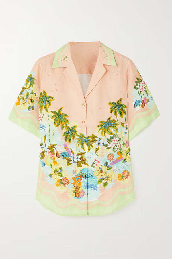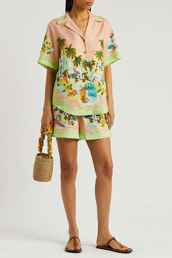 Coconut Scenery Linen Blend Tropical Print Blouse and Elastic Waist Pocketed Shorts Set