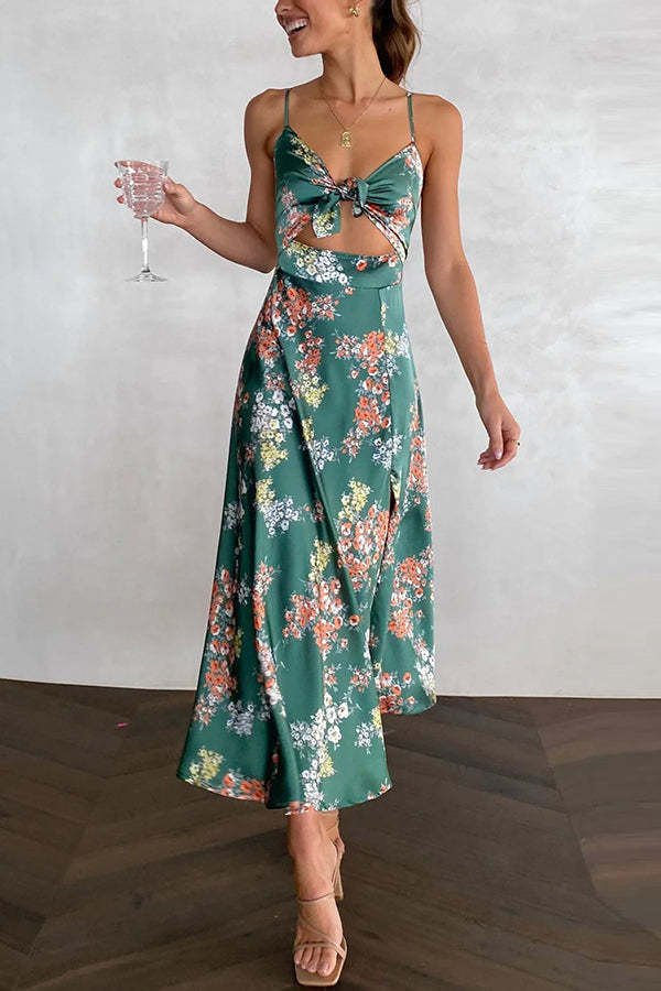 Dreamers Satin Floral Tie Up Slit Midi Dress