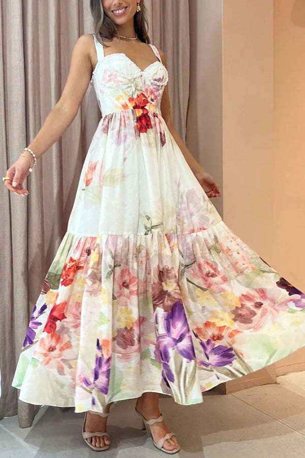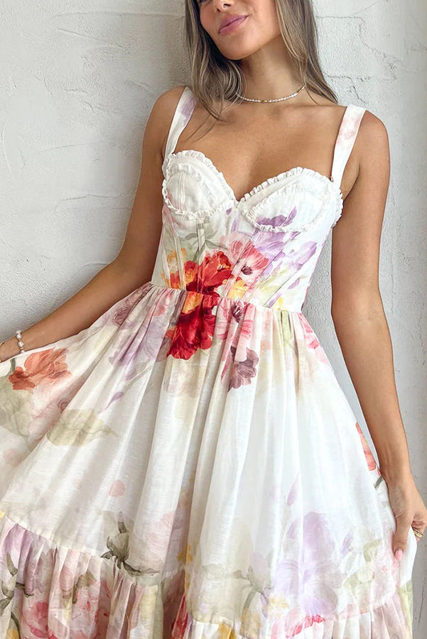 Romantic Date Floral Ruffle Detail Pocketed Corset Maxi Formal / Vacation Dress